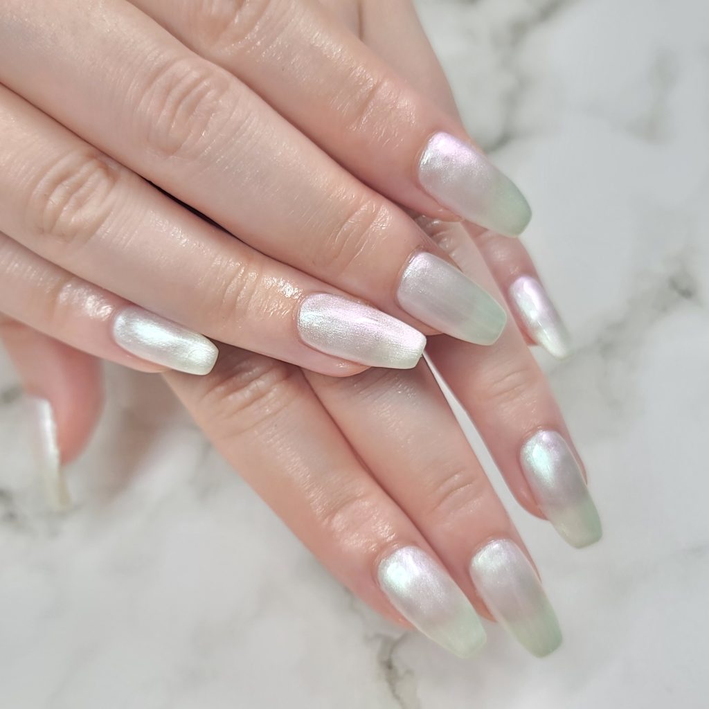 パール系カラーのネイルは、以下のように光沢があるのが特徴です。